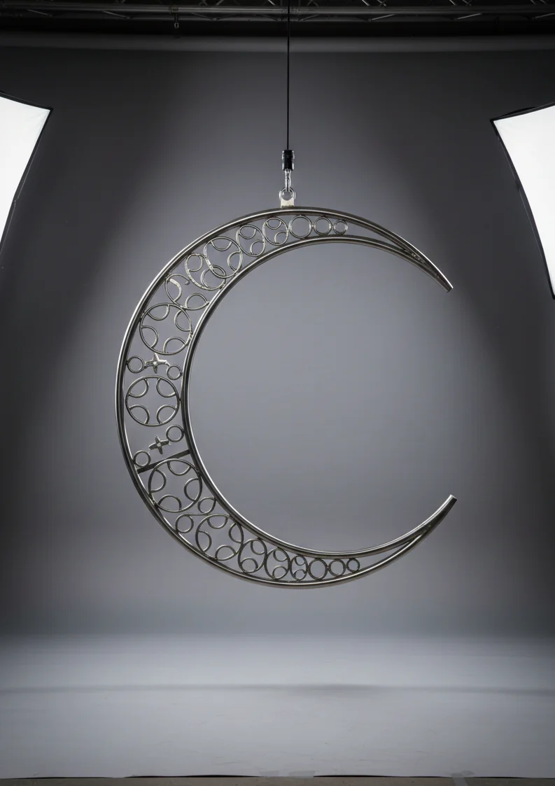 Professional volumetric aerial moon lyra made of polished stainless steel, featuring a decorative internal truss design, hanging in a bright white photo studio.