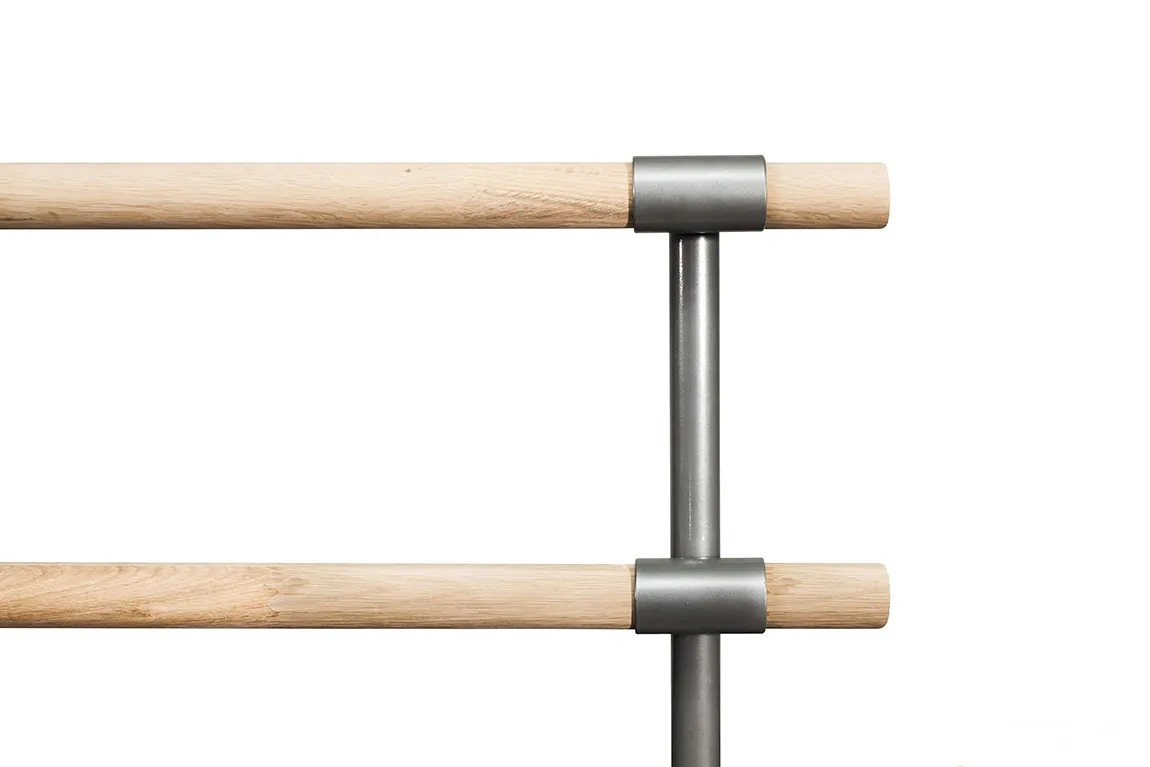 The height of the lower handrail is 75 cm from the floor, the height of the upper handrail is 110 cm from the floor. The length of the handrail is 2 meters. This makes the mobile ballet machine universal for both beginners and professionals.