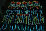 The clothing is made by cold light with 12 V power supply, you can choose one single color from 10 kinds of colors. There are two light patterns: static and flashing.