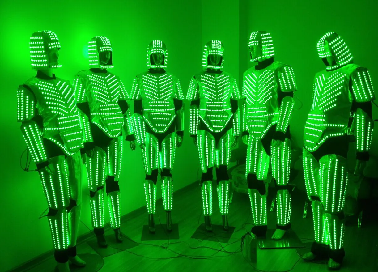 The clothing is made by LED5050 paster with 12 V power supply, you can choose a single color from red, yellow, white, green, blue, etc, or program colorful color through controller to design different patterns, such as gradient color, explosion flashing, flashing, slowly flashing, even combine all of that, then program the effect into the SD card and implant it to the clothing through software we developed. Other part around paster are made by cold light, having 10 kinds of color to choose from.
