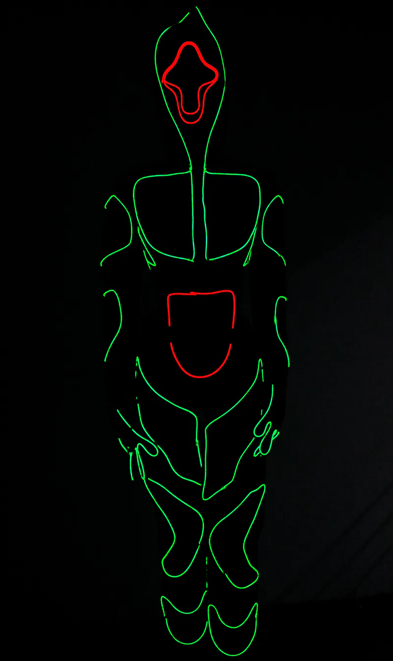 The clothing is made by cold light with 12 V power supply, you can choose one single color from 10 kinds of colors. There are two optional light patterns: static and flashing, and programable patterns designed by customers. Material: Cotton stretch Weight: 3.5kg