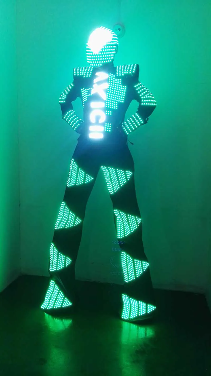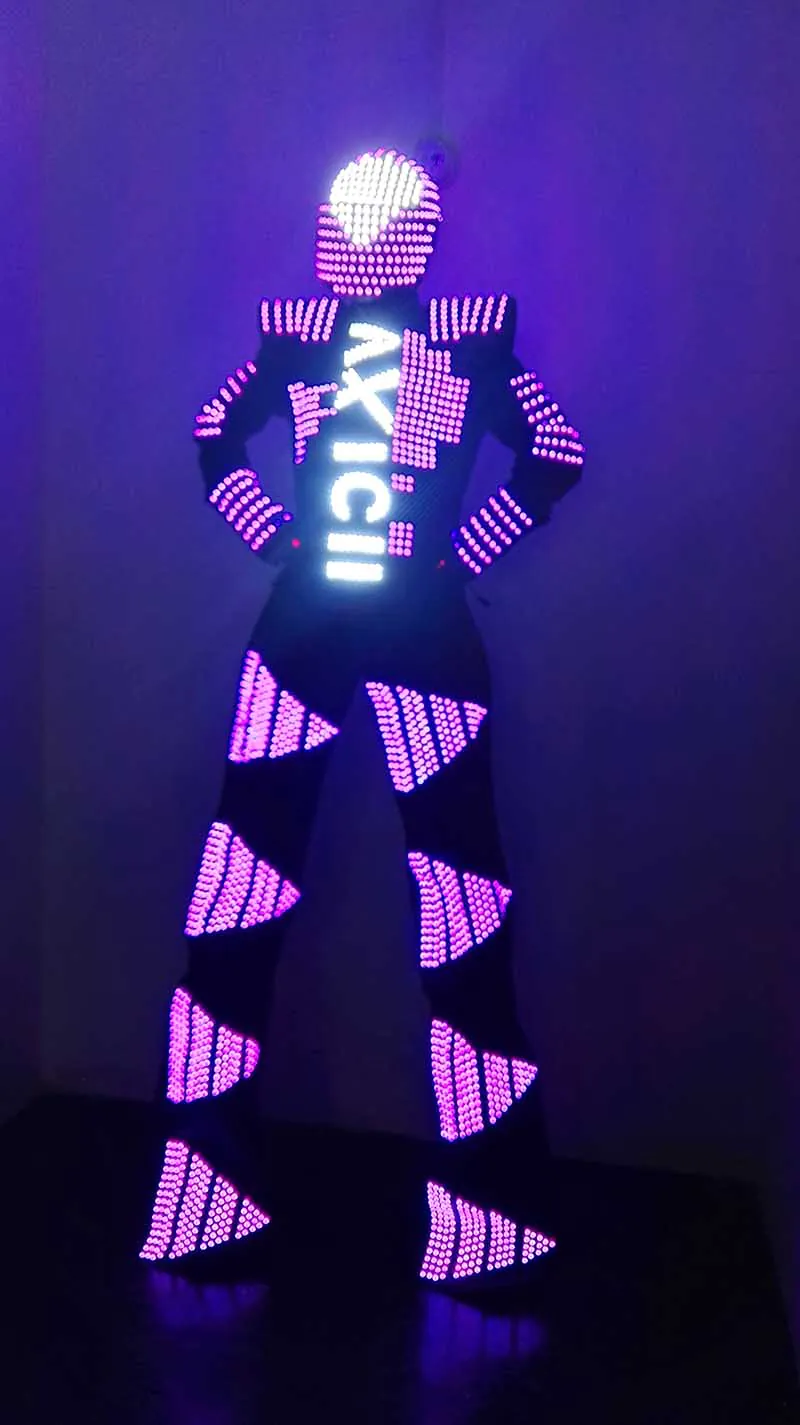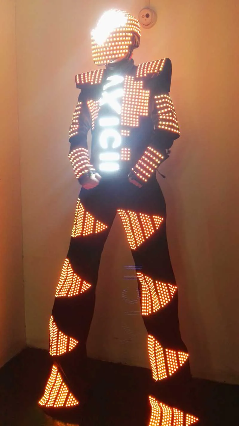 The clothing is made by LED full point light with 12V power supply, you can choose a single color from red, yellow, white, green, blue, or program colorful colors through controller to design different patterns, such as colorful meteor shower, changing color, chasing-pattern color, scanning, gradient color, explosive flashing, etc., even combine all of that, the programming can be designed according to the dance moves. Excelent for business performance, dancing shows, catwalk shows, bar, night salon, exhibition Material: Cotton stretch Weight: 4.5 kg What included: helmet, clothes, pants, screen, controller, remote-control, battery adapter Price with : Remote discoloration: 2475 SD card programming: 2700