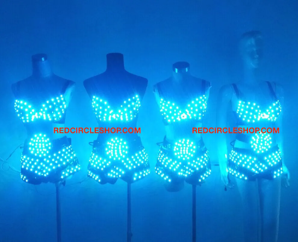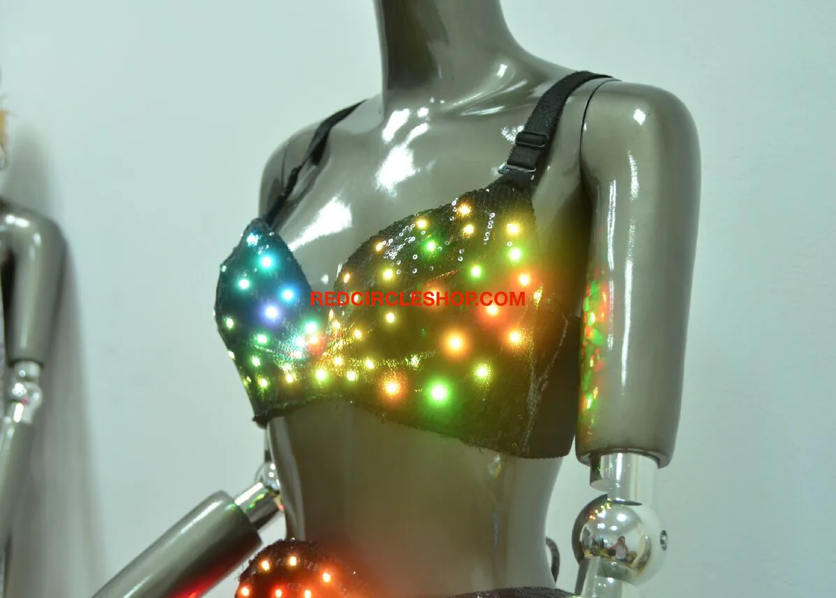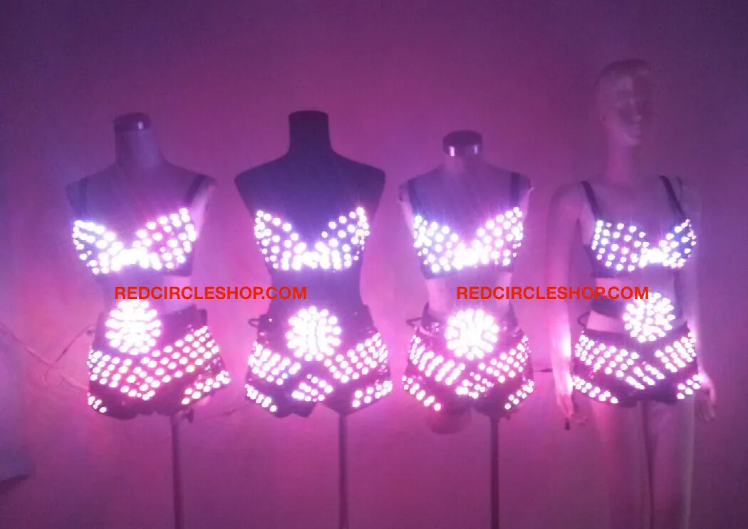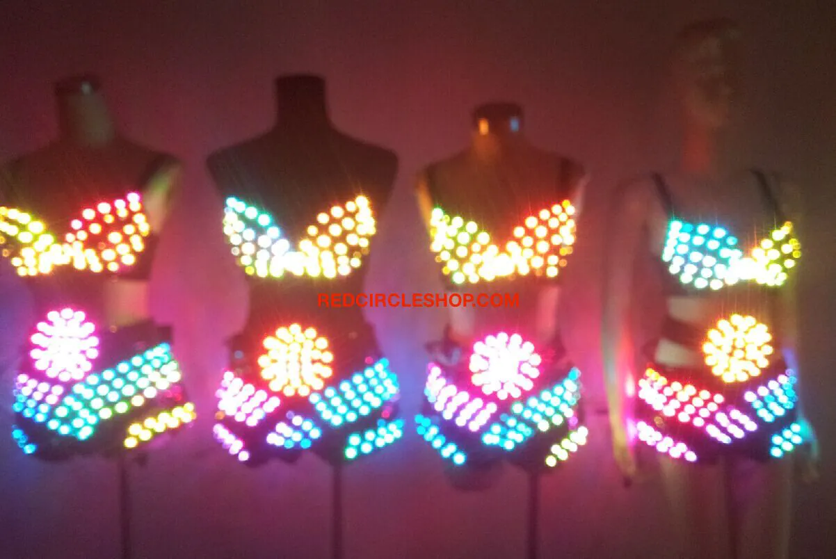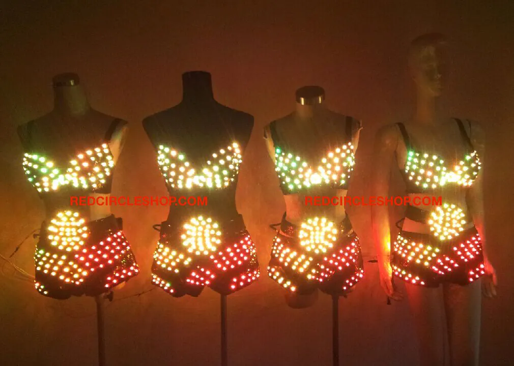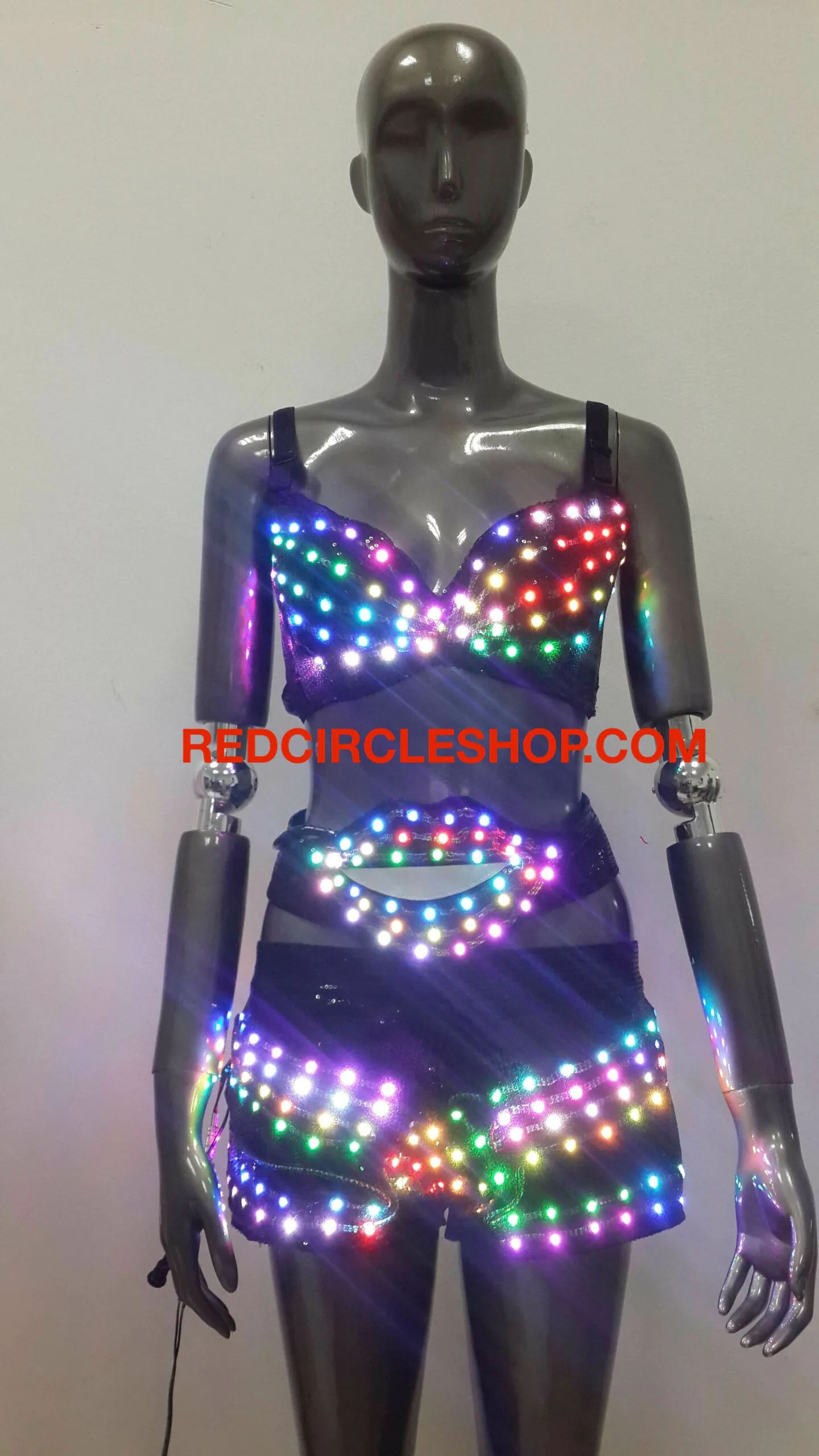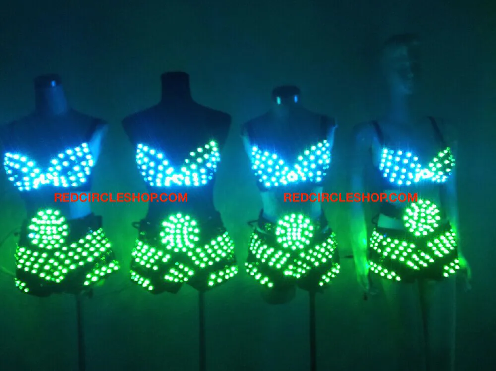 The clothing is made by LED full point light with 12V power supply, you can choose a single color from red, yellow, white, green, blue, or program colorful colors through controller to design different patterns, such as colorful meteor shower, changing color, chasing-pattern color, scanning, gradient color, explosive flashing, etc., even combine all of that, the programming can be designed according to the dance moves.