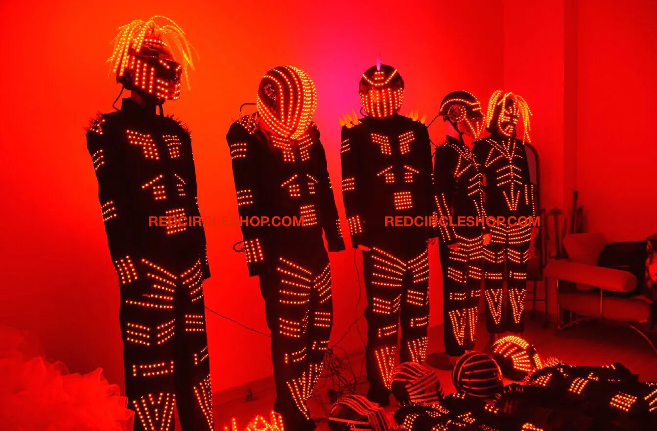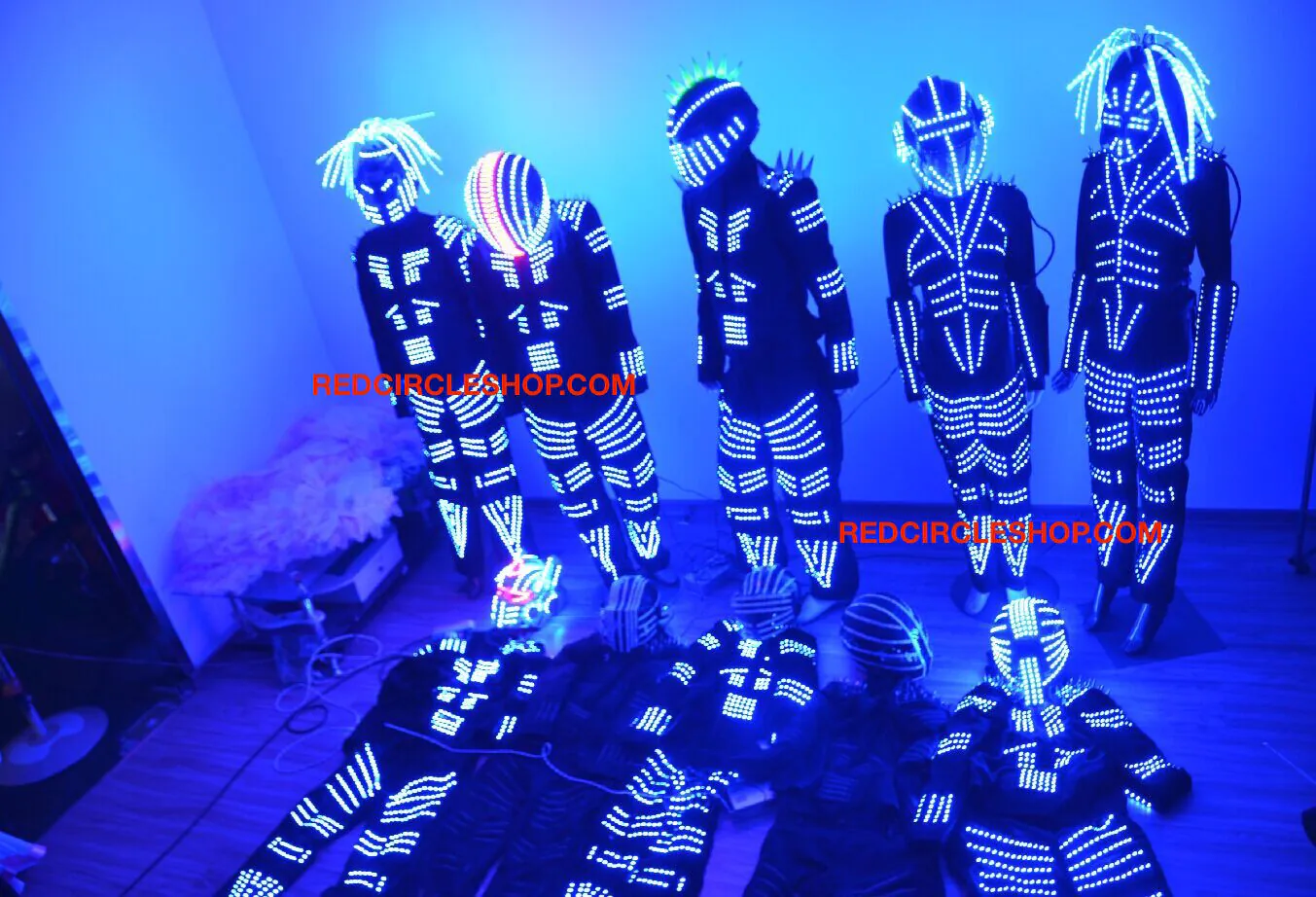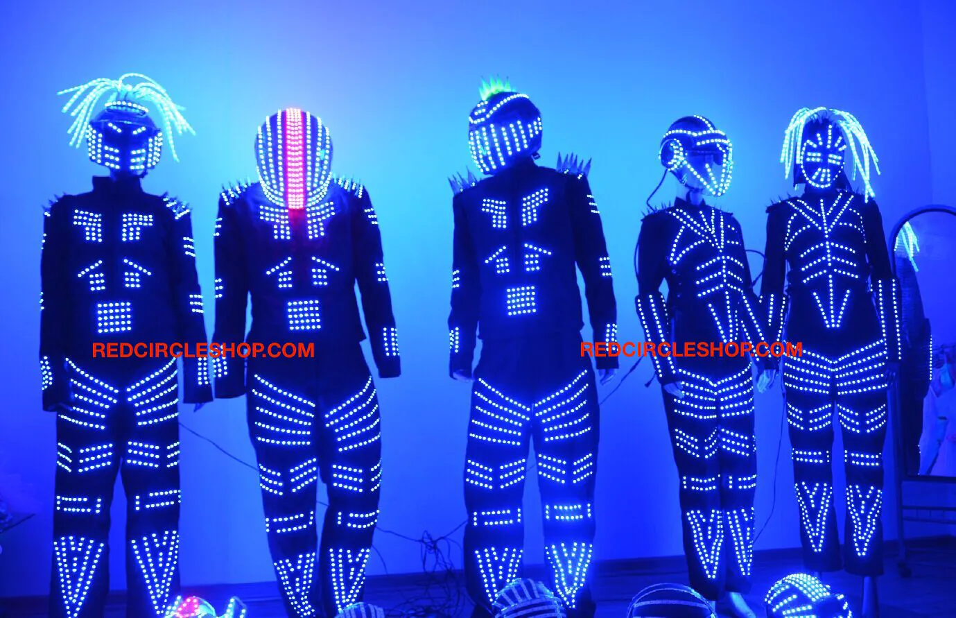 The clothing is made by LED5050 paster with 12 V power supply, you can choose one single color from red, yellow, white, green, blue, etc,or colorful color programmed by the remote control. The light patterns can be programmed according to the dance moves to scanning, explosion flashing, flashing, slowly flashing, etc. The price of programming depends on the time of dancing.