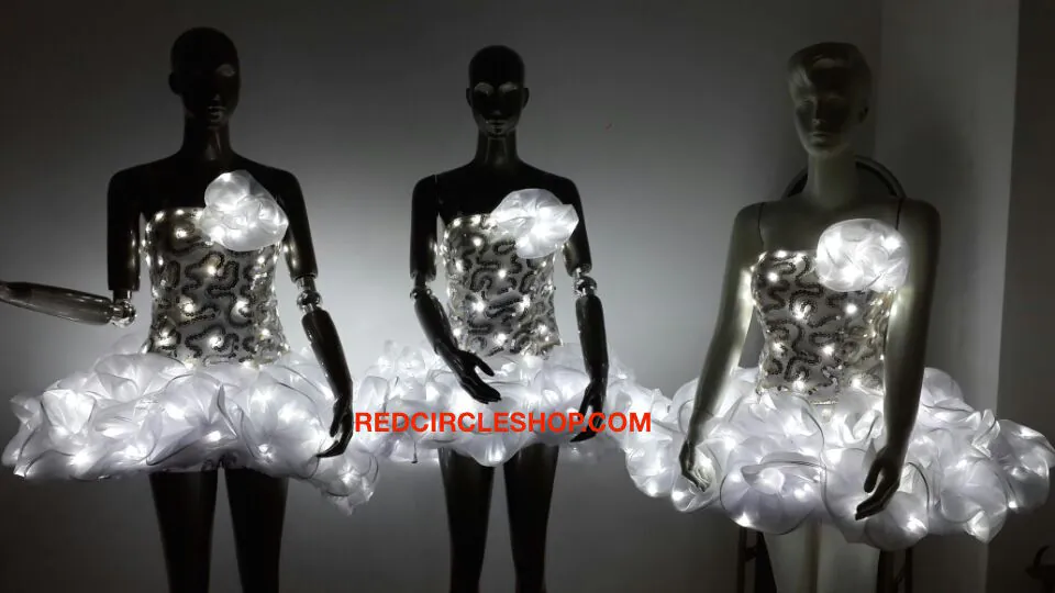 The clothing is made by LED colorful light, there are many colors to choose from, like red, green, blue and white. Material: Wedding dress fabric