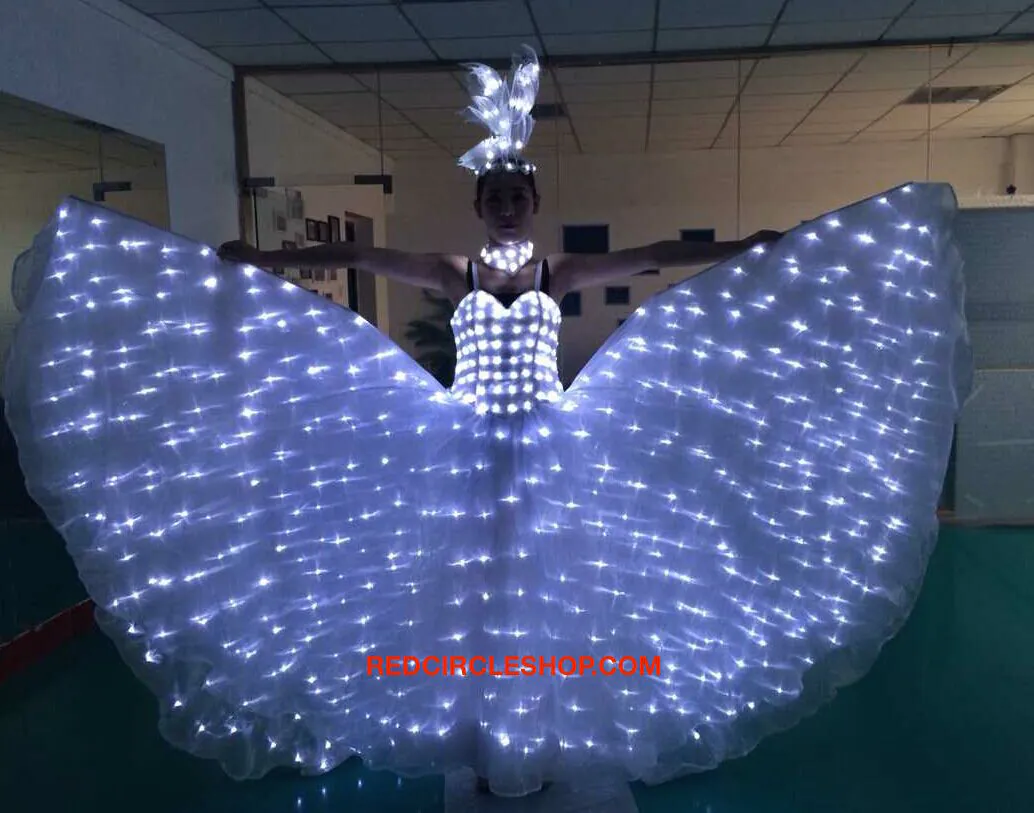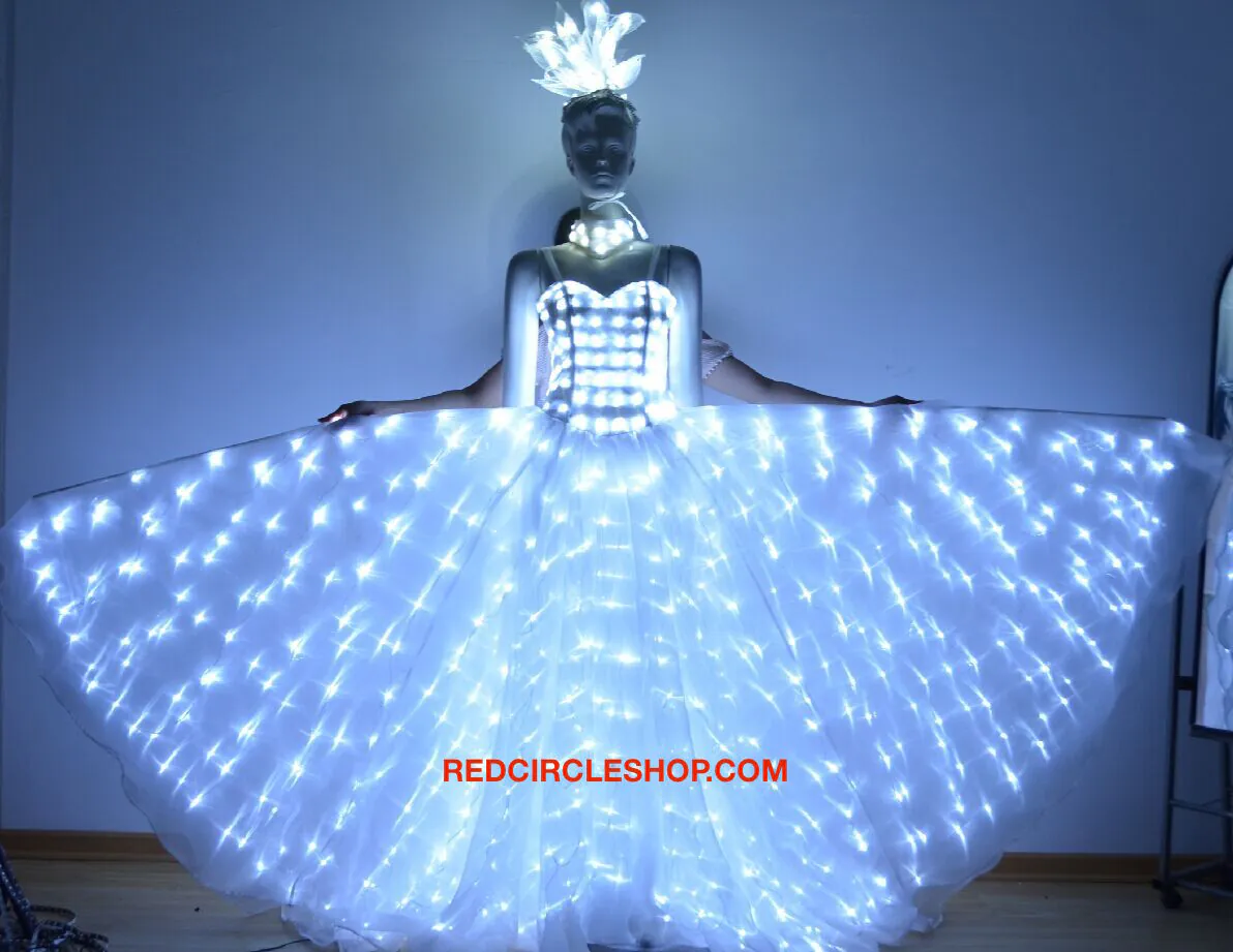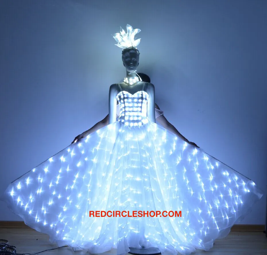 The dress is made by LED string lamps with 3.7 V power supply, you can choose one single color from white, red, blue, green, yellow, purple, pink and warm white, whole set of clothing has around 800 LED light.